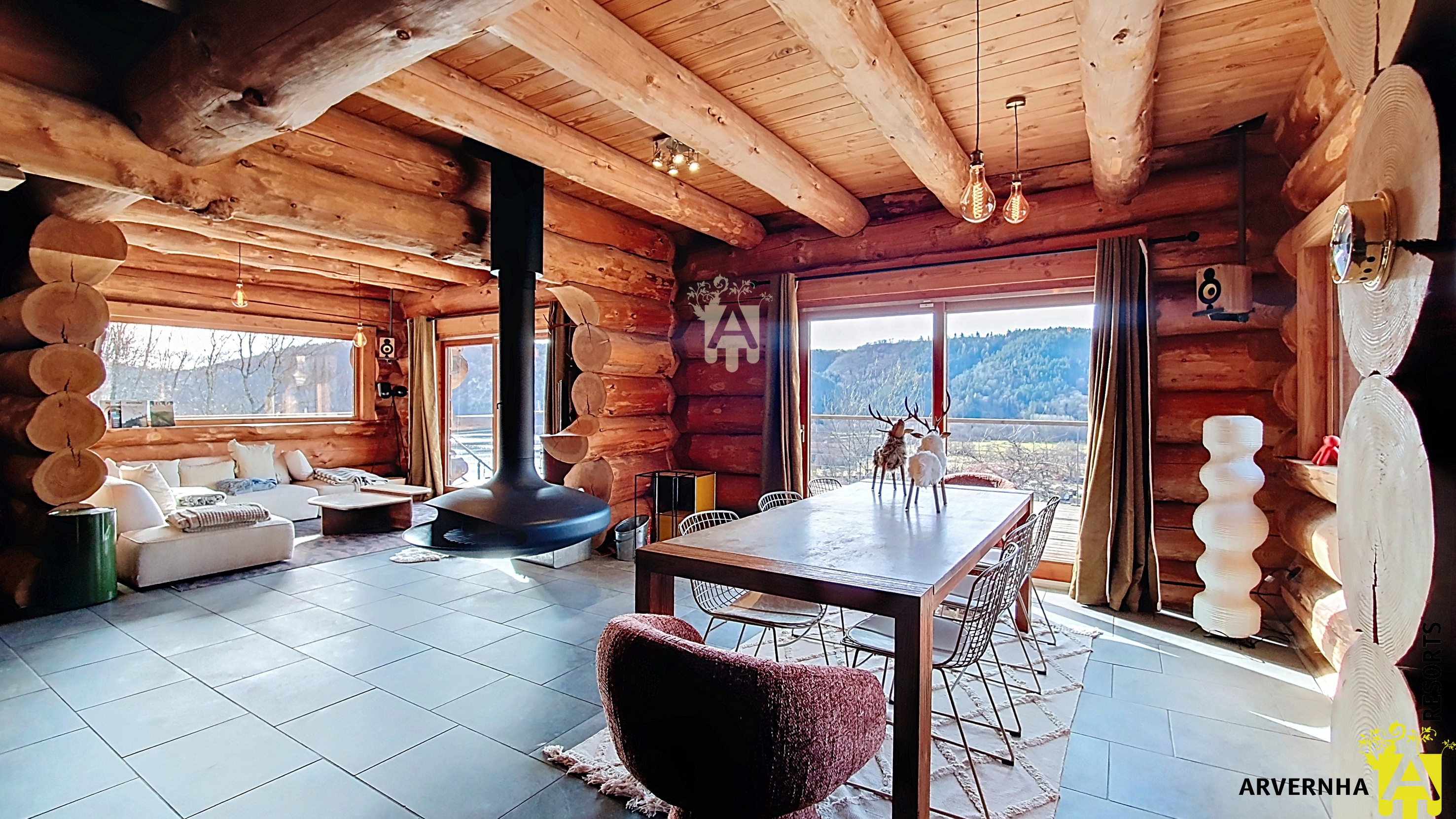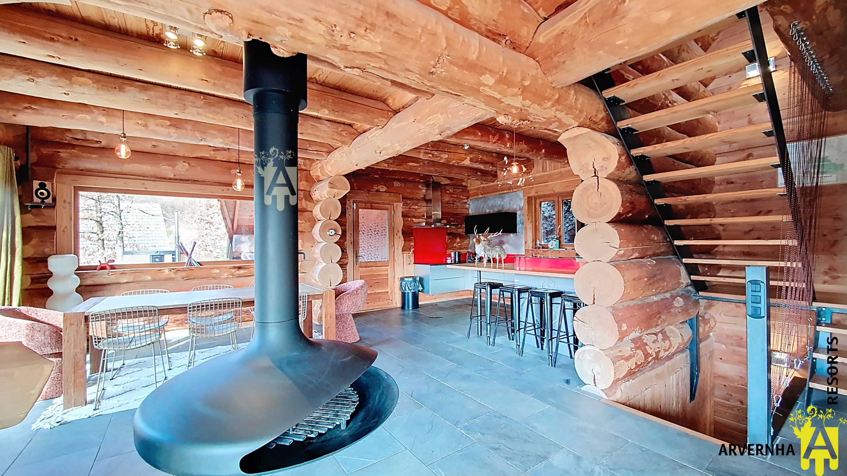 Arvernha Resorts vous propose une expérience unique au Chalet Trappeur sur les hauteurs du Lac Chambon, un véritable cocon en bois alliant charme, confort et panorama exceptionnel. Niché dans un environnement calme, le chalet en rondins de bois bénéficie d’une vue panoramique sur le Lac Chambon et le massif du Sancy, offrant un cadre idéal pour un séjour ressourçant en toute saison. Dès votre arrivée, vous serez séduits par l’atmosphère chaleureuse qui s’en dégage, où le bois, les volumes généreux et la lumière naturelle créent un lieu propice à la détente et au partage. Le chalet peut accueillir jusqu’à 8 personnes et propose à l’étage trois chambres confortables, (lits en 160cm). Deux de ces chambres disposent d’un balcon offrant une vue dégagée sur les montagnes environnantes. Une salle d’eau avec double vasque en pierre complète cet espace nuit. Au rez-de-chaussée, vous trouverez un grand dortoir composé de 4 couchages en lits superposés ou pourrons séjourné vos enfants dans leur espace réservé. Le Chalet Trappeur dispose également d’une salle de sport équipée pour garder vos vacances dynamiques. Le cœur du chalet s’organise autour d’une belle pièce de vie conviviale, sublimée par une cheminée suspendue au centre, autour de laquelle la cuisine ouverte, la salle à manger et le salon invitent à partager des moments inoubliables en famille. A l’extérieur, une immense terrasse prolonge les espaces de vie et permet de profiter pleinement du cadre exceptionnel. Que ce soit pour un repas, une pause de détente ou simplement pour admirer le paysage, tout est réuni pour savourer chaque instant. Pour rendre votre séjour unique, laissez-vous tenter par le bain nordique face au lac, pour un moment de relaxation hors du temps. Un lieu pensé pour ralentir, se retrouver et profiter pleinement de la nature environnante. Pour le confort de votre séjour, le linge de lit et de toilette est inclus et les lits sont faits à votre arrivée. Un kit bébé est à votre disposition (lit parapluie sans matelas + chaise haute) En supplément, nous vous proposons l’option ménage de milieu et/ou de fin de séjour Un forfait bûchette pour profiter au maximum du poêle et du bain nordique Les animaux sont acceptés dans ce logement (forfait animal en supplément – 1 animal maximum – forfait ménage en supplément obligatoire)? Tarifs de location à la semaine entre 1 590 € et 3 190 €. En réservant directement sur notre site Arvernha Resorts, vous bénéficiez d’une location sans commission d’agence ni frais de dossier (hors frais d’annulation le cas échéant). Pour tous renseignements ou demande de courts séjours, n’hésitez pas à nous contacter au 04.73.88.66.46 ou à l’adresse mail suivante :